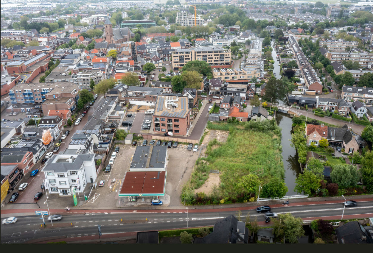 250409 Zuyt Brugge vanuit een droneZuyt Brugge, rechts midden, naast het tankstation. Volgens velen is daartussen ruimte voor garage-uitrit of straat naar de Secretaris Verhoeffweg (onder). Foto Thierry Schut