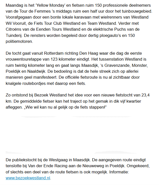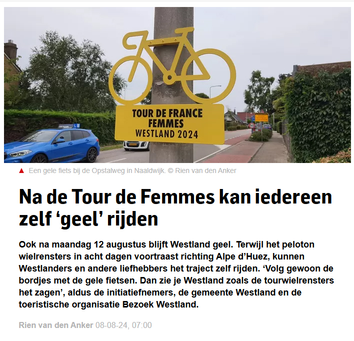 Eigen Tour Femmes in Westland fietsen 9 aug 9 augustus 2024 Meer lezen? Koptitel aanklikken 240808 Fietsen als de Tour de Femmes