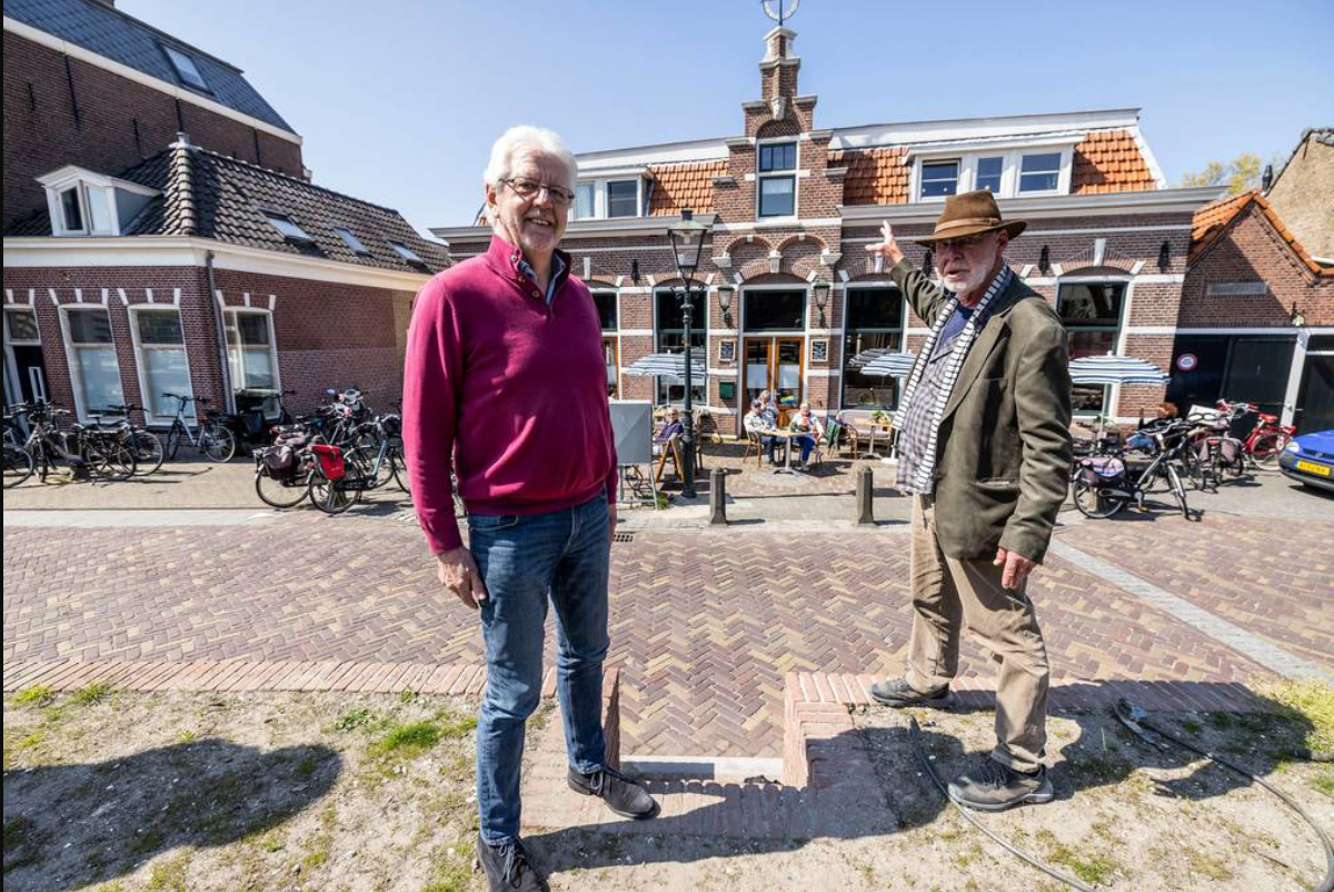 Links dirigent Koos van Beurden, rechts voorzitter Jan Holtkamp, op de plek waar vroeger de kroeg De Vergulde Valk was. FOTO THIERRY SCHUT