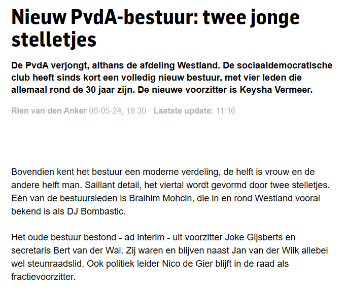 Twee jonge politieke stelletjes 7 mei 7 mei 2024 Het nieuwe PvdA-bestuur, tweede van rechts voorzitter Keysha Vermeer. FOTO PR. Verder lezen? Koptitel aanklikken. 240507 Nieuw bestuur PvdA
