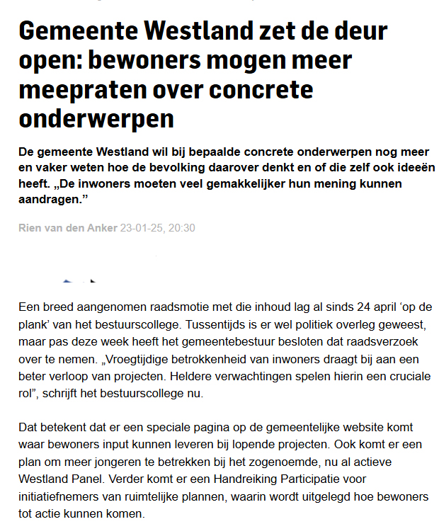 Burgers mogen meer meepraten 24 jan 24 januari 2025 Verder lezen? Koptitel aanklikken 250125 Westland wil bewoners meer laten meepraten