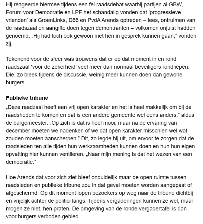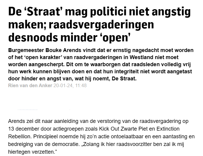 De Straat mag raadsleden niet angstig maken 20 jan 20 januari 2024 De gemeenteraad Westland, vlakbij het publiek. FOTO THIERRY SCHUT Verder lezen? Koptitel aanklikken 240123 Raad mogelijk minder open na verstoring