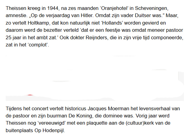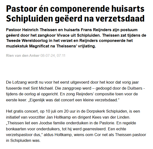 Eerbetoon pastoor én componerende dokter 9 jul 9 juli 2024 Pastoor Heinrich Theissen Verder lezen? Koptitel aanklikken. 240708 Posthuum geëerd na verzetsdaden