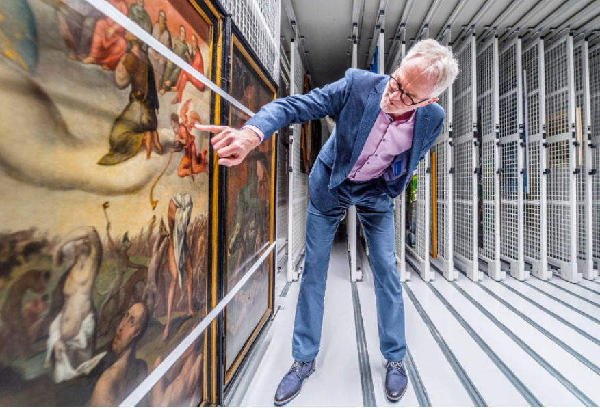 Wethouder Piet Vreugdenhil in het Westlandse kunstdepot. FOTO FRED LEEFLANG