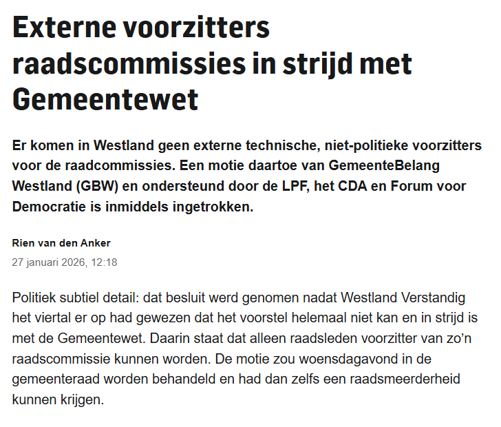Jurist Peter wijst raad subtiel op de Gemeentewet 28 jan 28 januari 2026 Verder lezen? Koptitel aanklikken. 260128 Externe voorzitter mogen niet