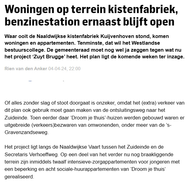 Kisten-Kuijf wordt volgebouwd 5 apr 5 april 2024 Het vroegere terrein Kisten-Kuijf in Naaldwijk. FOTO THIERRY SCHUT. Verder lezen? Koptitel aanklikken 240405 Huizen op terrein kistenfabriek
