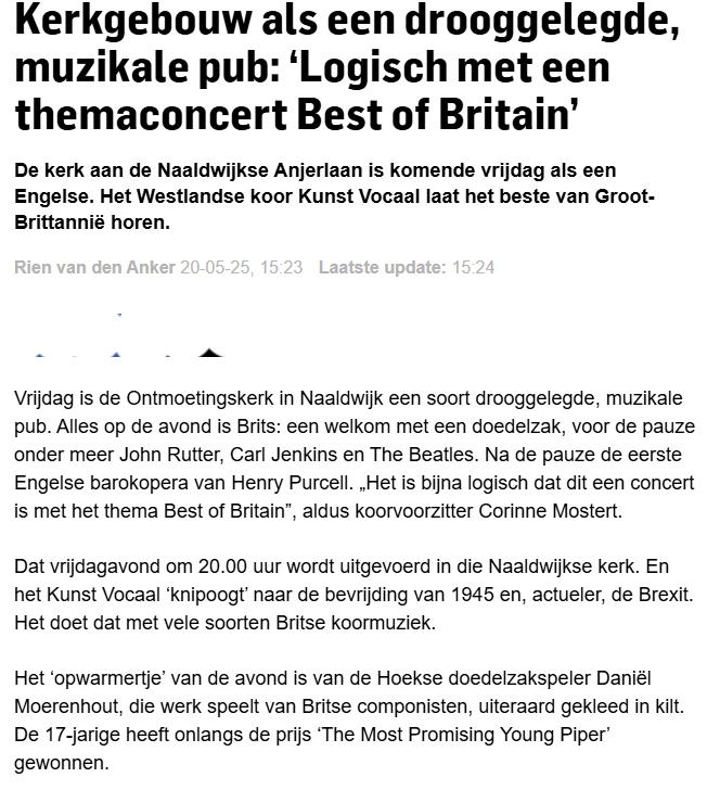 Kunst Vocaal laat Best of Britain horen 23 mei 23 mei 2025 Druk op ‘Lees verder’. 250522 Kerkgebouw één avond Britse pub