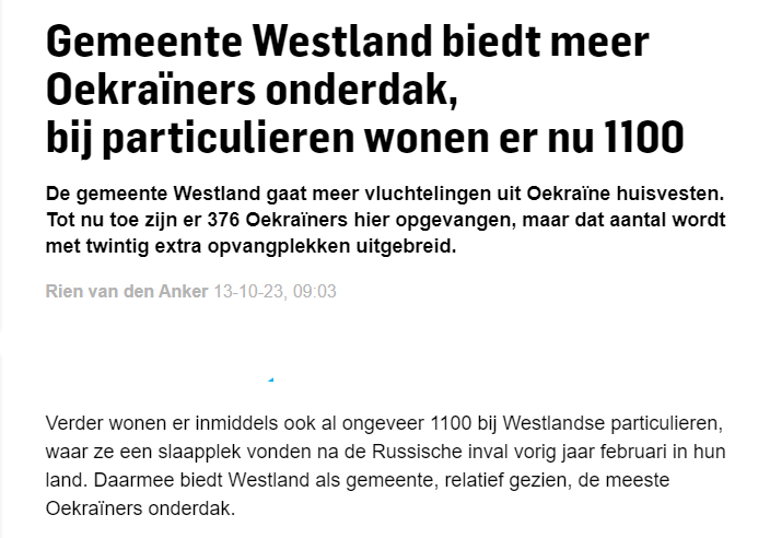Meer Oekraïners naar Westland 13 okt 13 oktober 2023 Verder lezen? Koptitel aanklikken 231013 Westland biedt meer Oekraïners onderdak