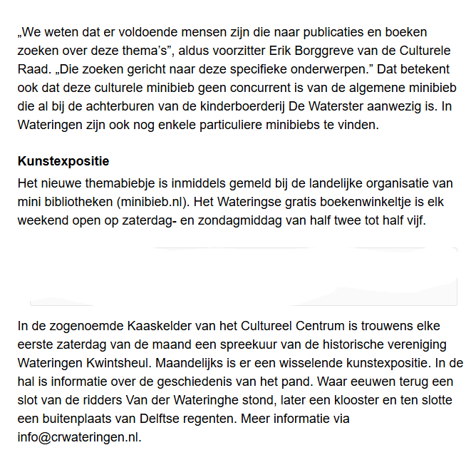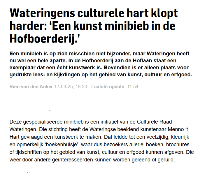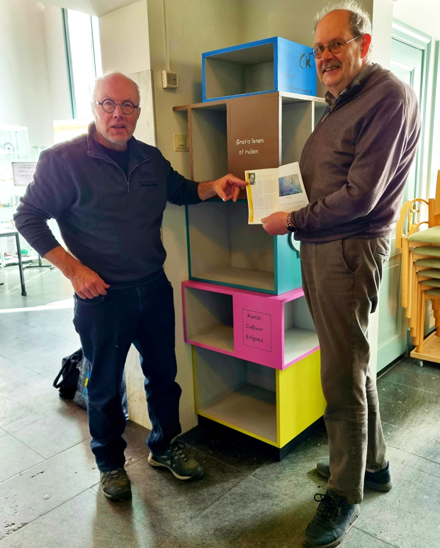Minibieb in echt kunstwerk 18 mrt 18 maart 2025 Kunstenaar Menno ‘t Hart (l) en CRW-voorzitter Eric Borggreve, Foto PR Meer lezen? Koptitel aanklikken. 250319 Kunstwerk als minibieb