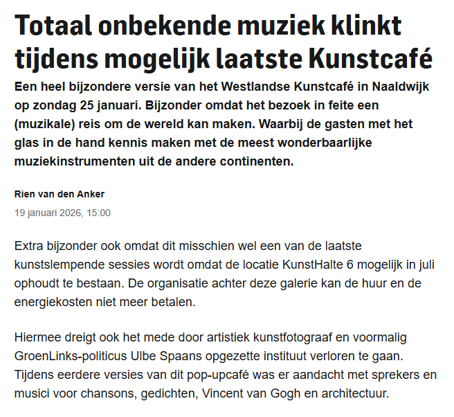 Onbekende muziek op mogelijk laatste Kunstcafé 21 jan 21 januari 2026 Ineke en Kees spelen hun bijzondere muziek. Foto PR