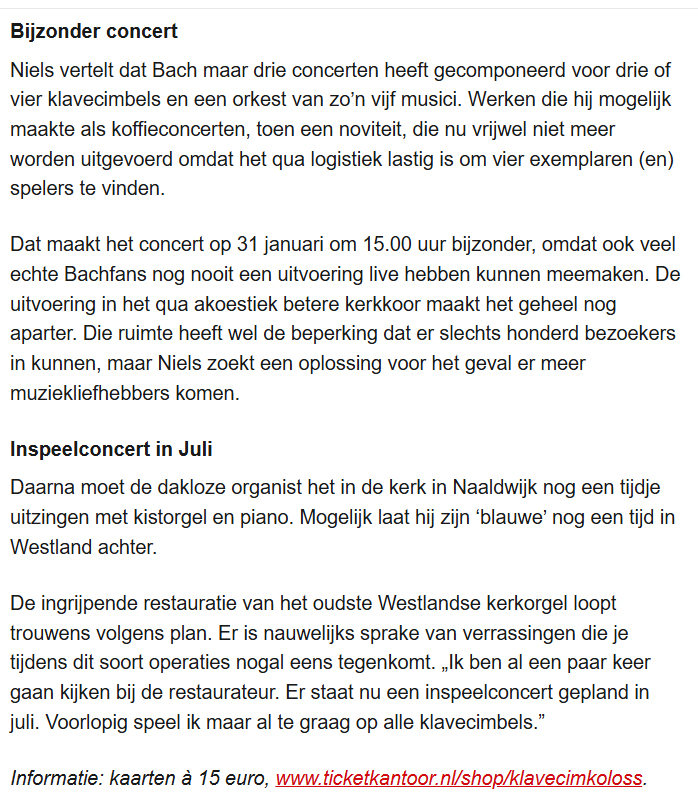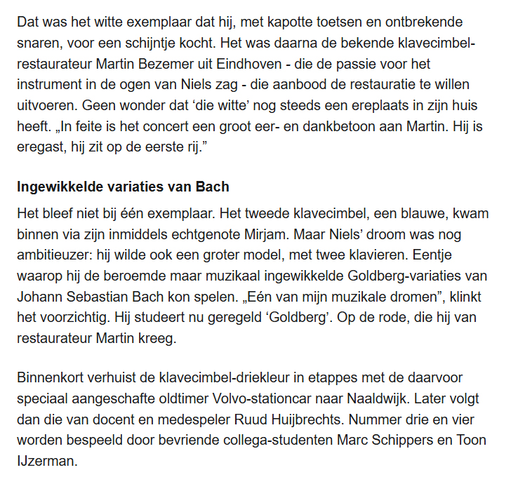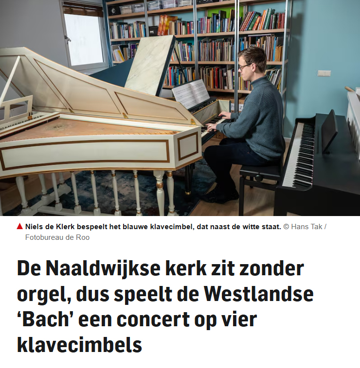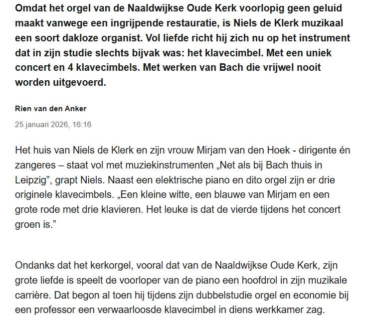 Naast orgel is Niels’ liefde de klavecimbel 24 jan 24 januari 2026 Verder lezen? Koptitel aanklikken. 260121 Niels troost zich met klavecimbels