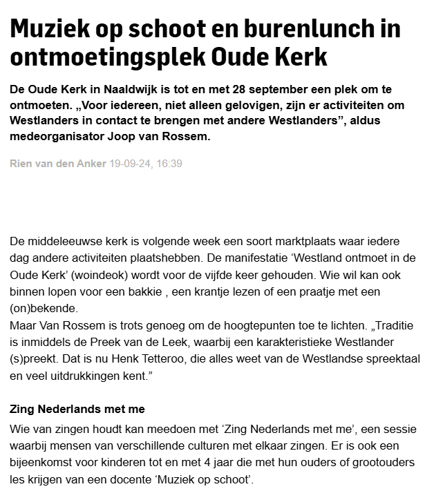 Ook een praatje maken een (on)bekende 20 sep 20 september 2024 Muziek op schoot met (groot)ouders in de ontmoetingsplek Oude Kerk. Foto PR. Verder lezen? Koptitel aanklikken. 240921 Ook Burenlunch in Oude Kerk