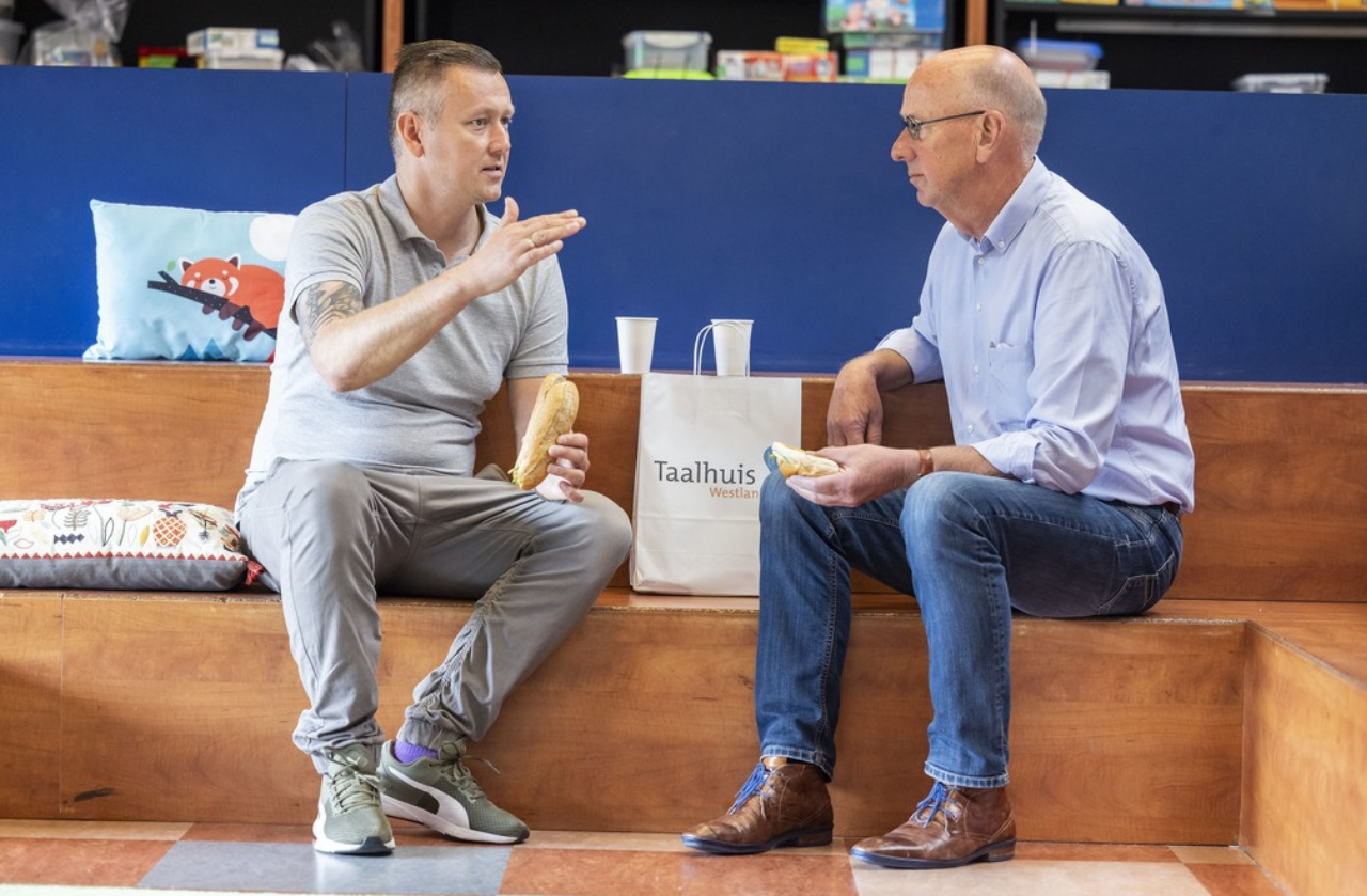Aad van Schie (rechts) met zijn Poolse taalmaatje. FOTO THIERRY SCHUT