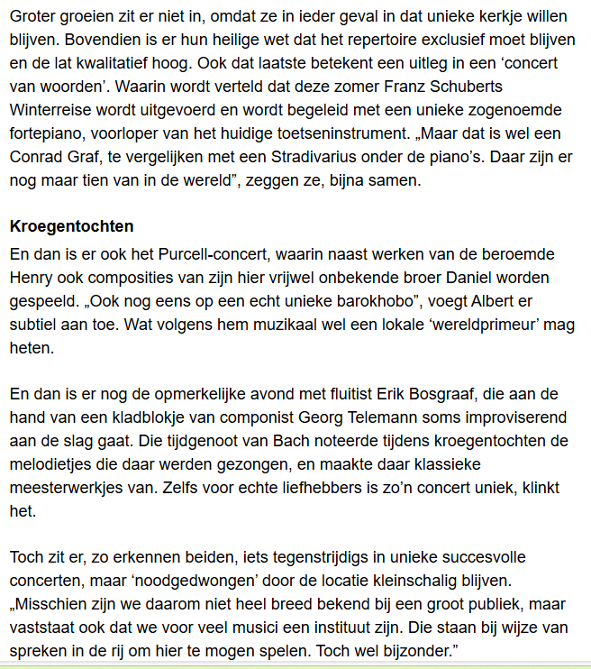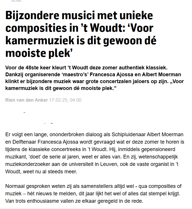 ‘t Woudt, dé mooiste plek voor Kamermuziek 19 feb 19 februari 2025 Francesca Ajessa en Albert Moerman bij het orgel in ‘t Woudt. Foto Thierry Schut. Verder lezen? Koptitel aanklikken. 250217 Authentiek klassiek in ‘t Woudt