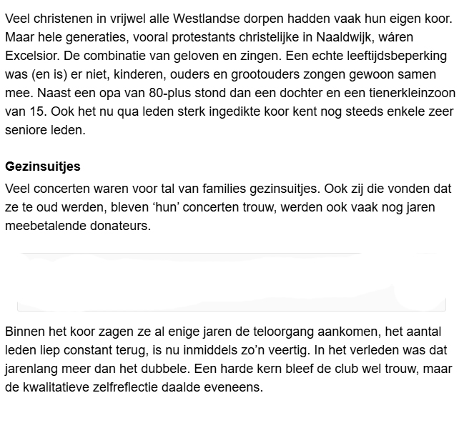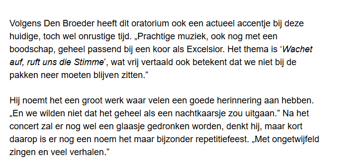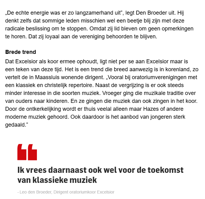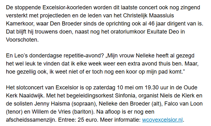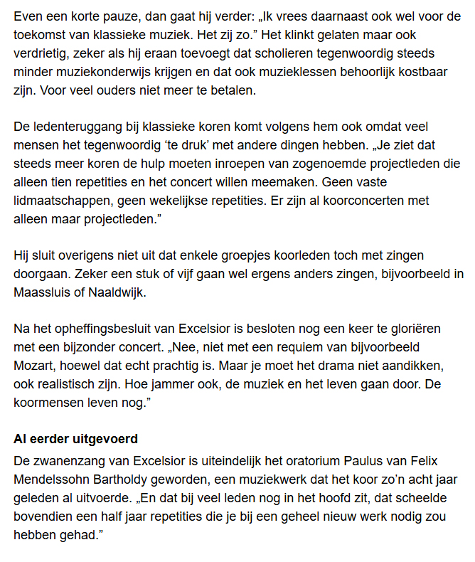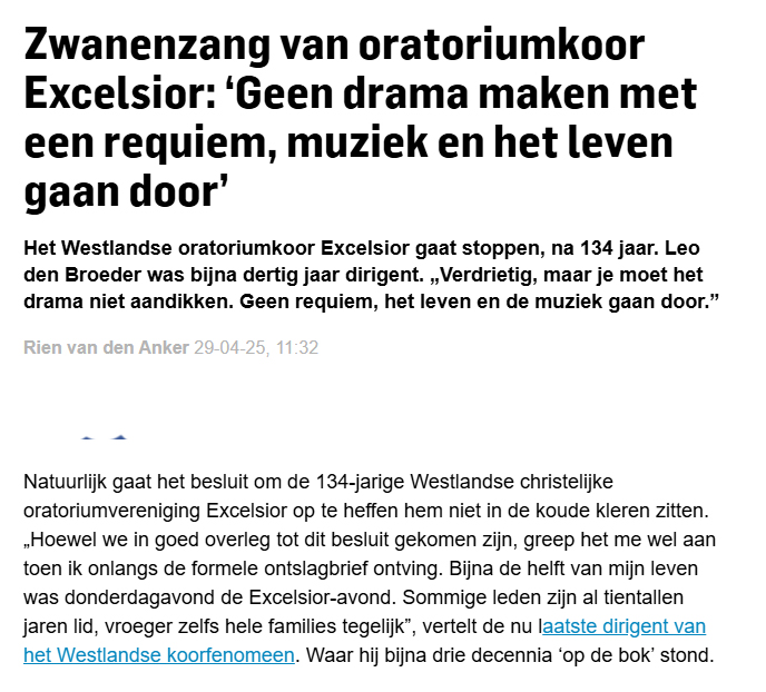 ‘Verdrietig, maar het drama niet aandikken’ 29 apr 29 april 2025 Leon de Broeder tijdens de koorrepetitie. Foto Thierry Schut Leo den Broeder van de COV Excelsior. Foto Thierry Schut Verder lezen? Koptitel aanklikken 250429 Excelsior stopt na 134 jaar