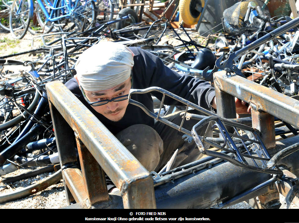 De Japanse kunstenaar Kouji Ohno bij zijn ‘fietsenman’. FOTO FRED NIJS