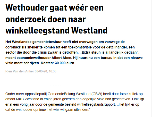Het is al eens meer uiteengezet. De achtereenvolgende colleges hebben van Westland een verdienmodel gemaakt voor een ieder die diensten aanbiedt. Wethouder Abee, die hier zijn tijd uitzit omdat hij volgens het CDA-banenregister voor promotie aan de beurt was, voegt zich naadloos hierin. Er schijnt onder belanghebbenden een soort “sukkellijst” te bestaan, waarop ook Westland zou staan, van gemeenten en openbare lichamen welks vertegenwoordigers snel zwichten voor binnenlopende babbelaars. Dat achtereenvolgende rapporten, adviezen en wat er meer is verdwijnen, soms met een stempel geheim, in bureauladen, kasten en uiteindelijk in het archief is goed voor de werkgelegenheid.