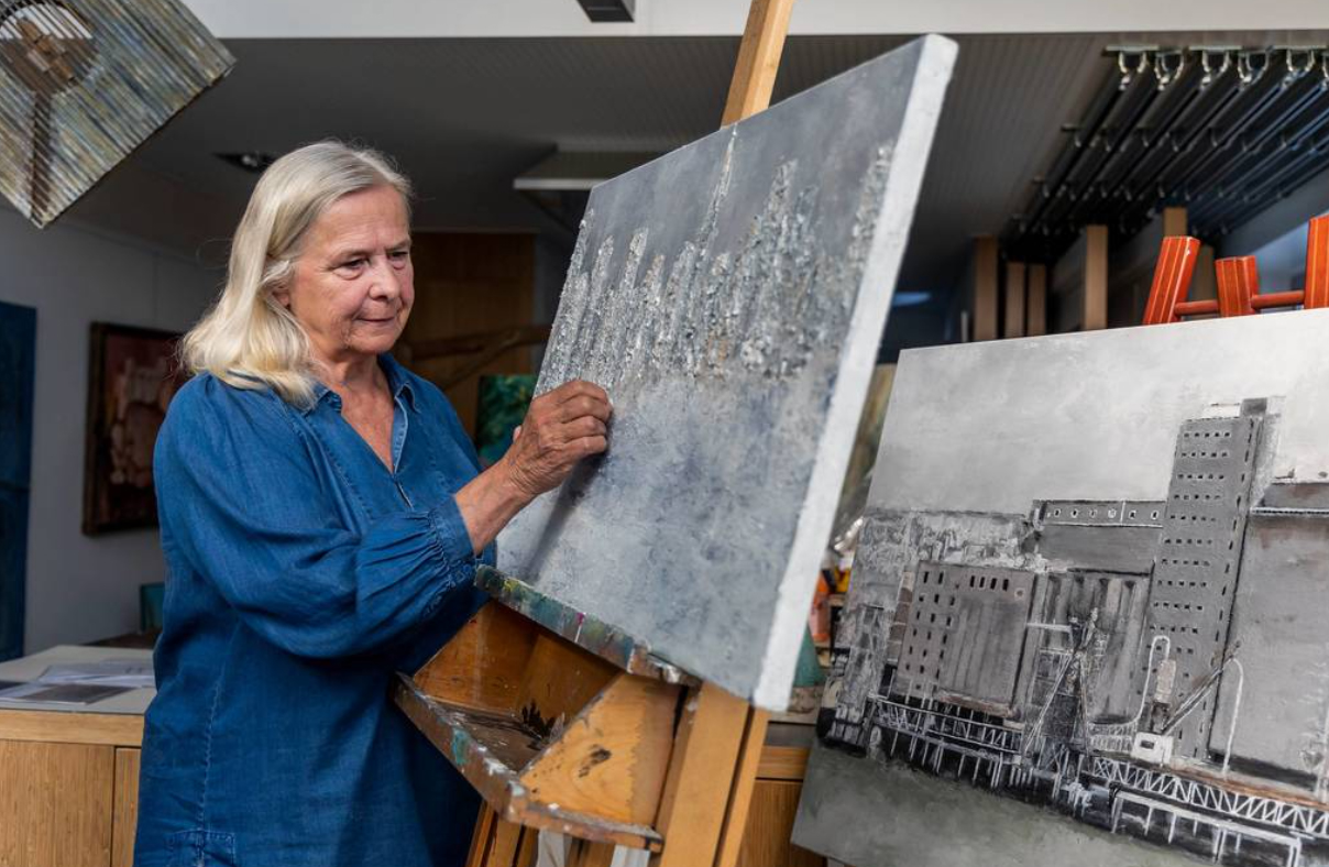 Leny Droog met haar reliëf kunstwerk en de ‘bijna-foto’ van as. en kalk. FOTO THIERRY SCHUT