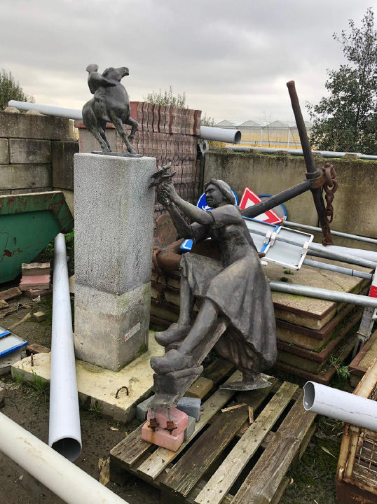 (Westland, 9 november 2019). Een nieuwe beeldenrel in Westland. De Druivenkrentster, een subtiel kunstwerk dat ooit de tuin van het voormalige ‘s Gravenzandse raadhuis sierde, is tussen de rotzooi van de gemeentewerf in De Lier ‘opgedoken’. Gewoon op zijn kant neergeflikkerd tussen pijpen, oude verkeersborden en andere troep.