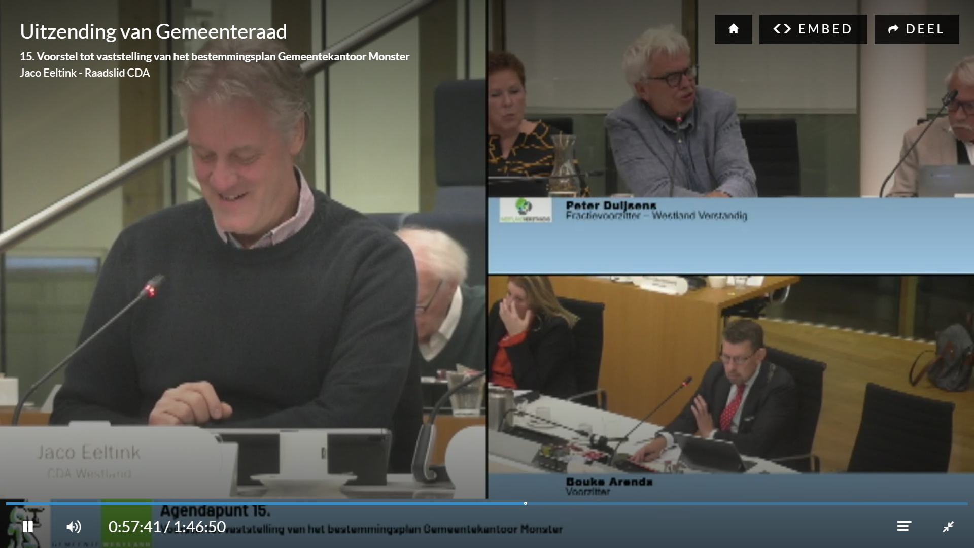 Een soort debatbeeld, links CDA-raadslid Jaco Eeltink, de onvermijdelijke Duijsens en daaronder een voorzittende burgemeester.